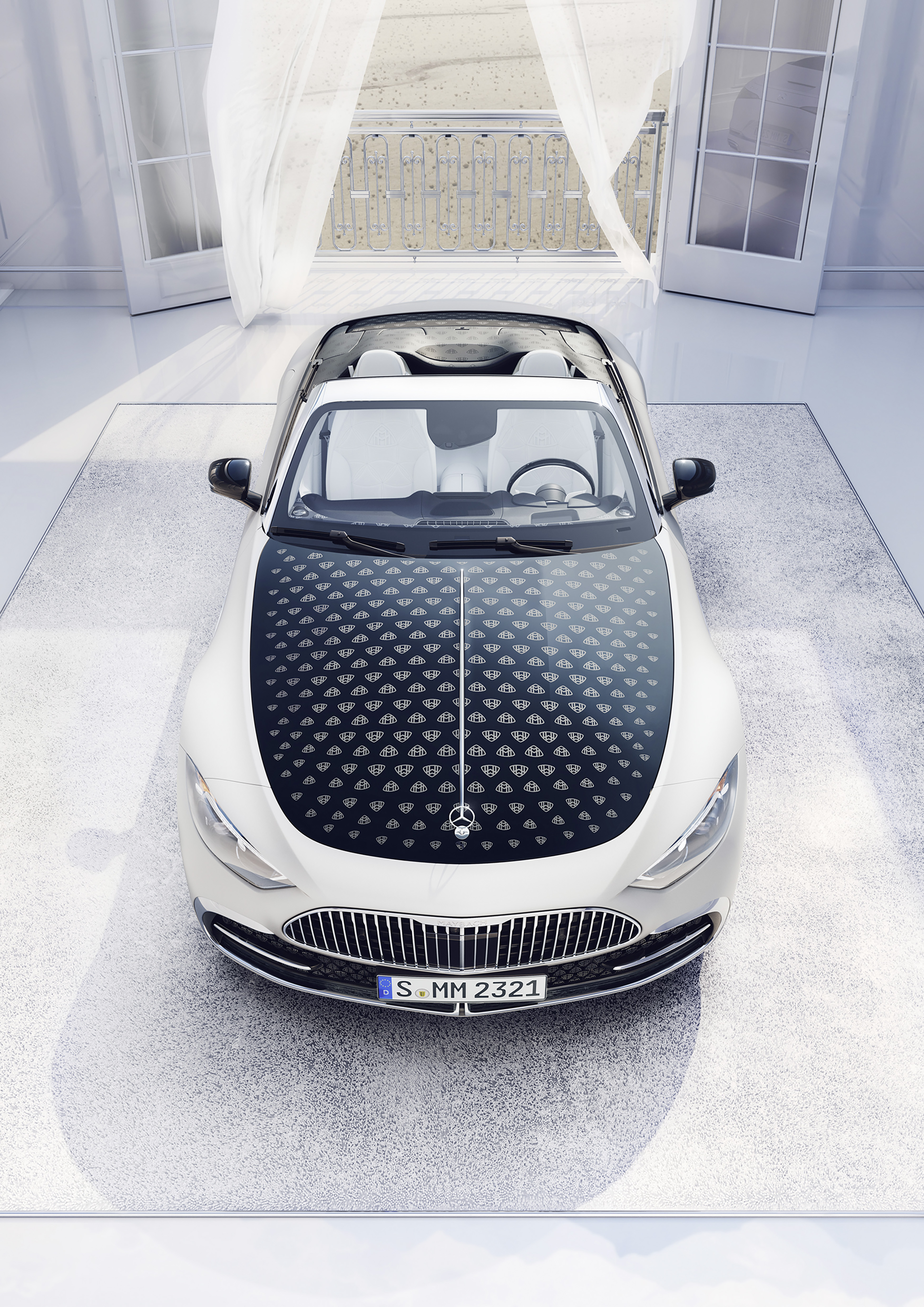 주목할 만한 점은 블랙 소프트탑에 적용된 안트라사이트 색상의 마이바흐 로고 패턴이다. 이 패턴은 옵션으로 후드에도 적용할 수 있어, 차량의 개성을 더욱 강조할 수 있다. 후드에 패턴을 적용할 경우, 금속 패널을 수작업으로 샌딩한 후 디자인을 프린트하는 정교한 과정을 거친다.