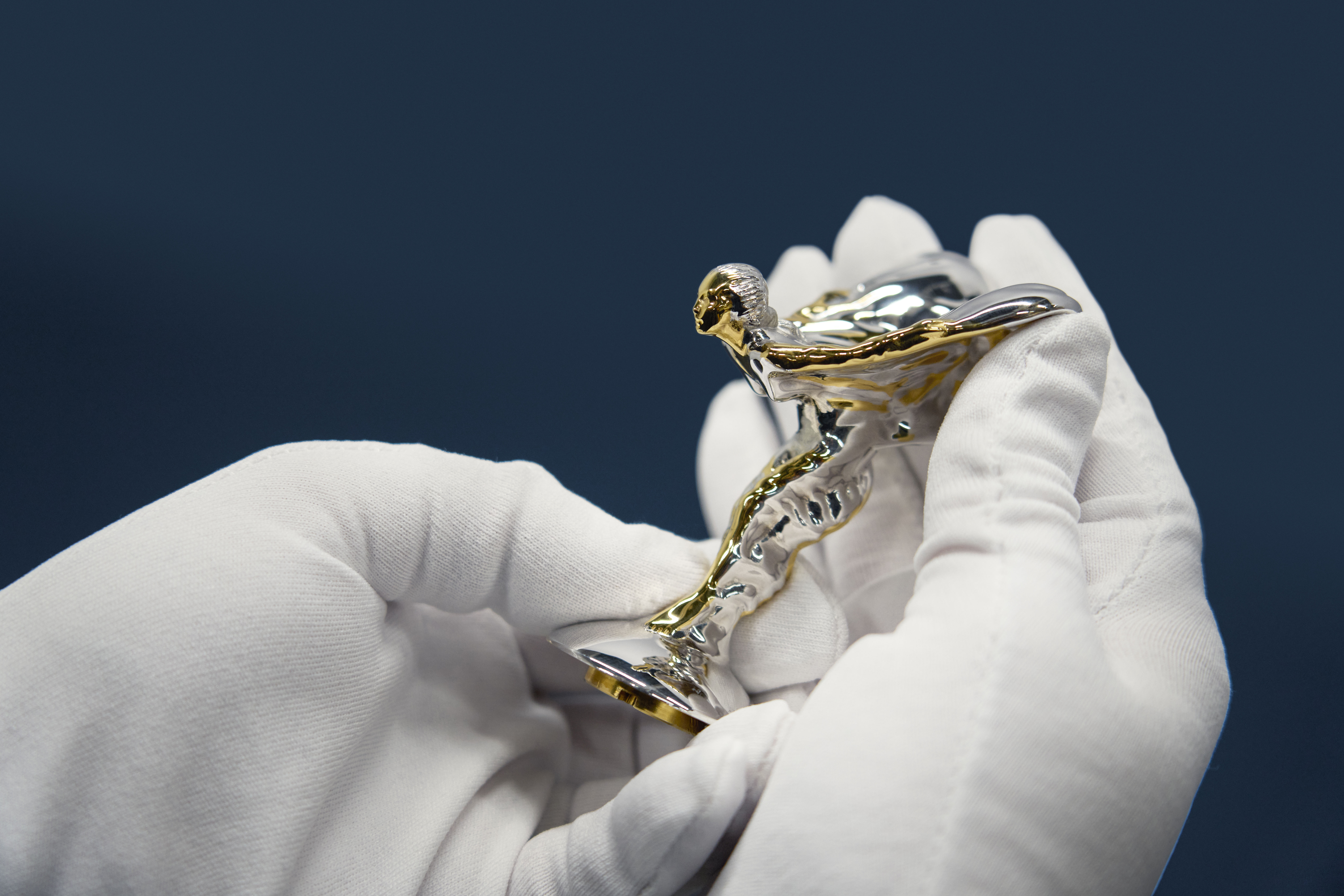 외관은 영화 속 차량과 동일한 옐로우 컬러로 마감됐으며, 블랙 투톤이 차체를 감싸듯 이어진다. 21인치 디스크 휠은 실버 허브캡과 조화를 이루며 1937년 모델의 분위기를 재현했다. 보닛 위 스피릿 오브 엑스터시는 영화 속 골드의 밀수를 연상케 하는 독특한 마감이 눈길을 끈다. 순은 소재의 마스코트에 18K 골드를 부분 도금해 은색 코팅 아래 금이 숨겨져 있는 듯한 효과를 연출했다.