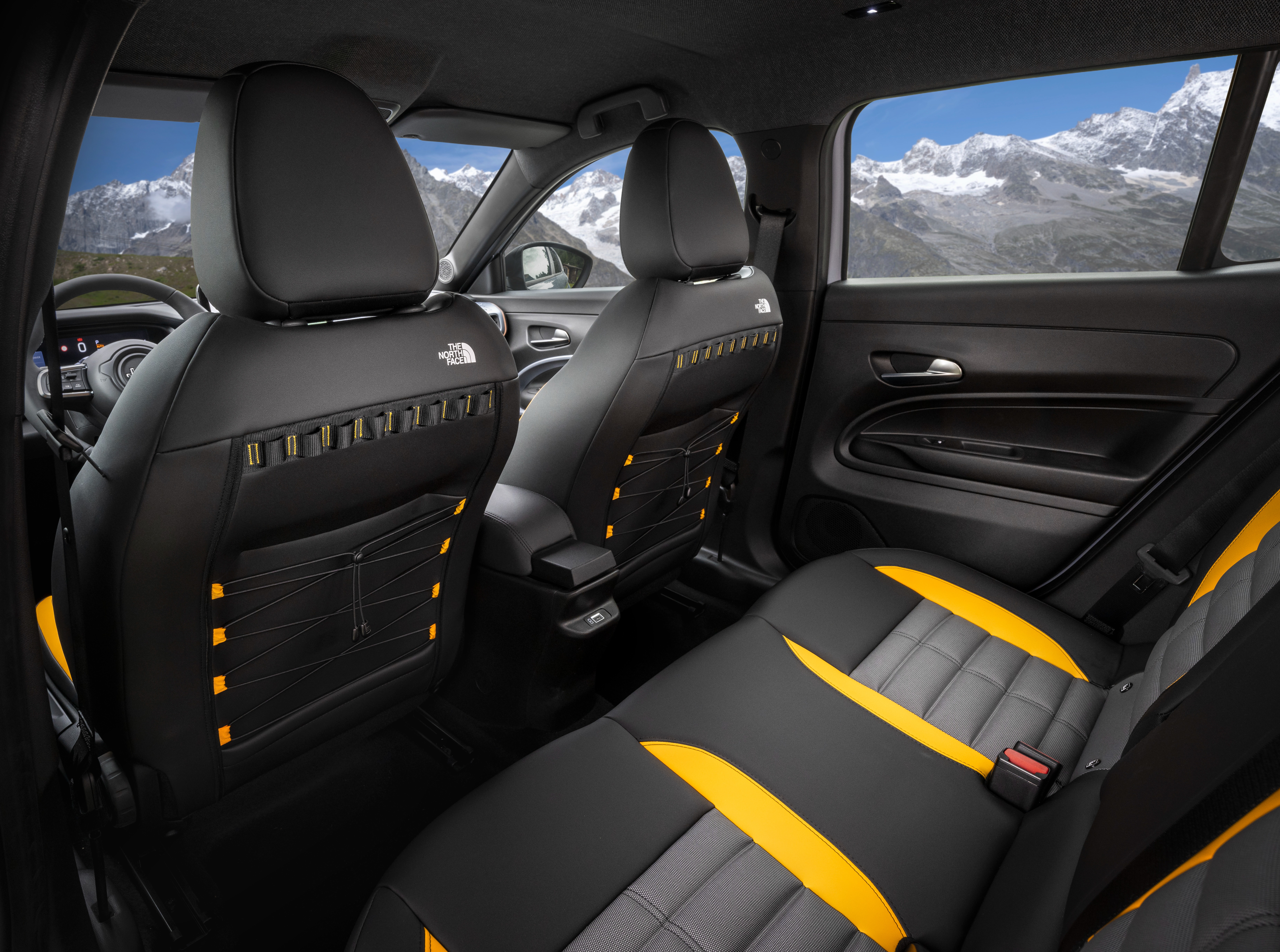 실내는 대시보드에 몽블랑 실루엣과 한정판 넘버를, 플로어 매트에는 3D 산맥 디자인을 적용했다. 시트는 노스페이스 패딩 재킷에서 영감을 받았으며, 등받이에는 배낭을 연상케 하는 탄성 스트랩이 더해졌다.