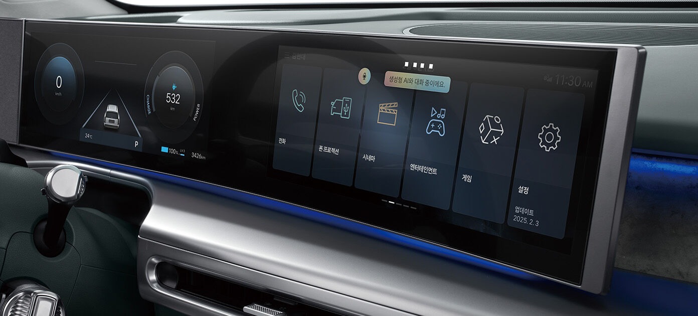 실내는 첨단 기술의 향연이다. 12.3인치 곡면 디스플레이가 운전석을 감싸고 있으며, 생성형 AI 기반의 음성인식 시스템이 탑재됐다. 중앙 콘솔인 ‘유니버설 아일랜드 2.0’은 최대 190mm까지 뒤로 밀릴 수 있어 2열 승객도 편리하게 사용할 수 있다. 특히 주목할 만한 점은 차량 출고 후에도 원격 주차 보조나 디스플레이 테마 등 원하는 기능을 추가로 구매할 수 있다는 것이다.
