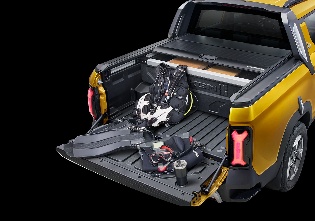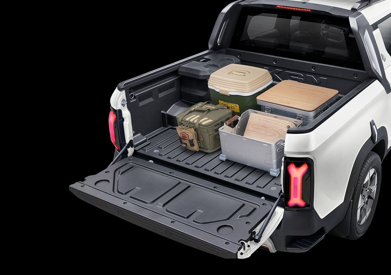 무쏘 EV의 가장 큰 차별점은 실용성이다. 최대 500kg까지 적재 가능한 화물칸과 중형 SUV 수준의 넓은 실내를 동시에 갖췄다. 2열은 850mm의 무릎 공간(커플디스턴스)과 슬라이딩 기능, 32도 각도 조절이 가능한 리클라이닝 시트로 탑승객 편의성을 극대화했다.