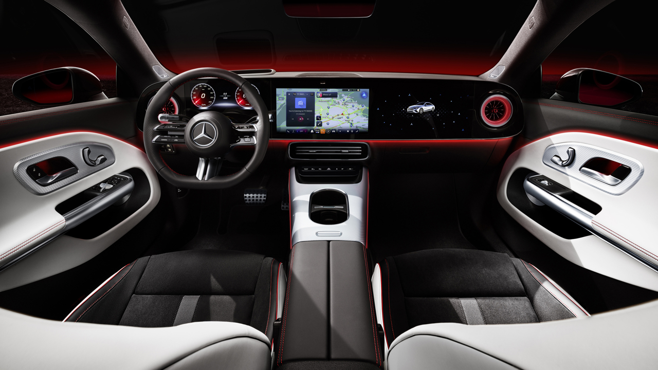 실내는 최소화된 디자인 철학에 따라 핵심 요소만 강조했다. 옵션으로 제공되는 MBUX 슈퍼스크린은 26cm(10.25인치) 운전자 디스플레이와 35.6cm(14인치) 중앙 디스플레이를 하나의 유리면 아래 통합했으며, 출시 후에는 조수석에도 14인치 디스플레이가 추가될 예정이다.
