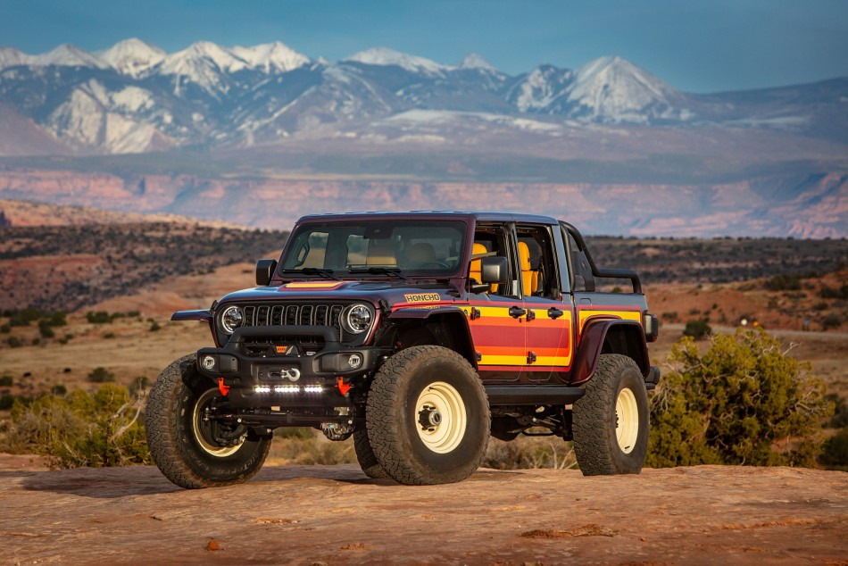 지프 글래디에이터 루비콘 하이탑 혼초 콘셉트는 1970년대 중반부터 사랑받아온 헤리티지 스타일을 현대적으로 재해석한 오프로드 픽업으로, 모파와 JPP 팀의 성능 극대화 철학을 담아 모압 트레일을 겨냥해 제작됐다. 헤리티지 그래픽, 40인치 화이트 레터 타이어 장착 스틸 휠, 플랫 펜더, 다나 60 액슬, 에어 서스펜션, 록 슬라이드 파워 스텝, DECKED 베드 수납 시스템, 컬러 매치 하드탑 등으로 외관을 강화했고, 내부는 퀼팅 처리된 투톤 가죽 시트, JPP 로고 헤드레스트, 도어실 가드, 올웨더 매트 등으로 프리미엄 감성을 더했다.