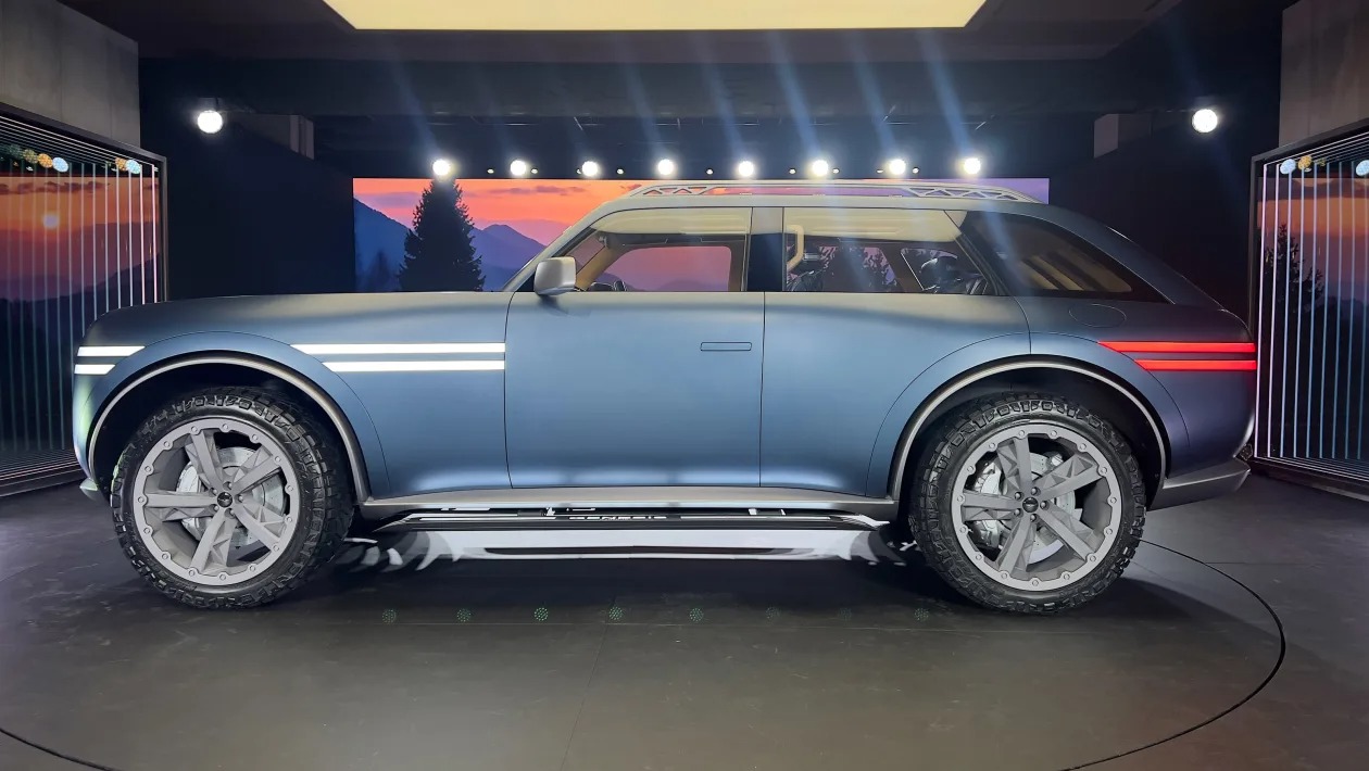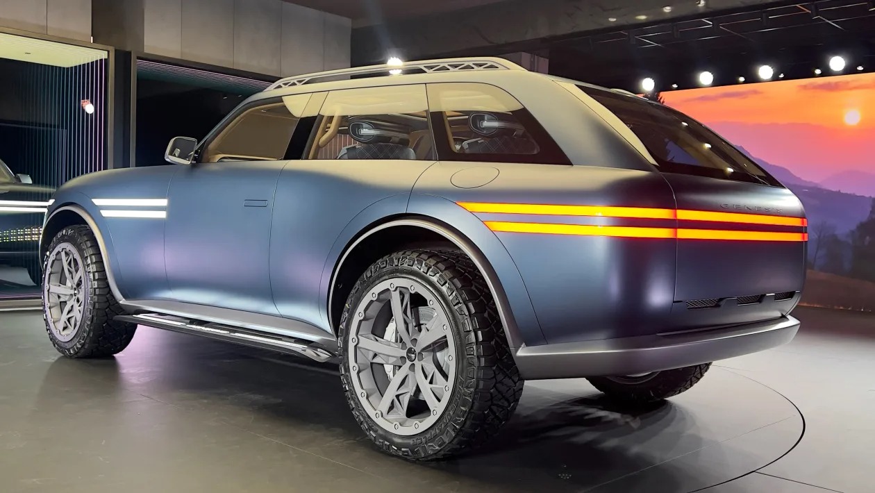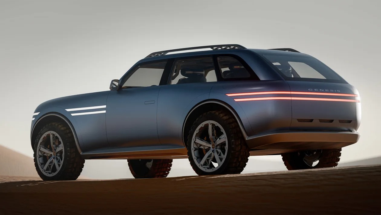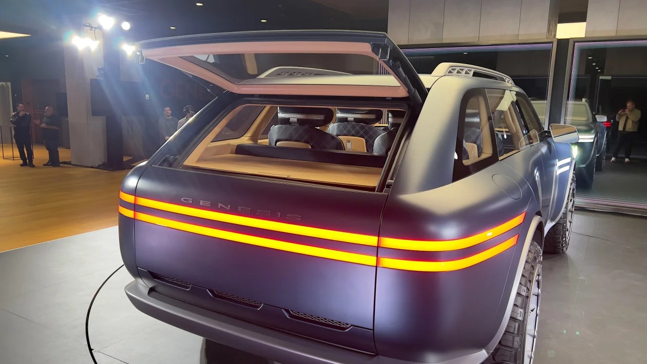 특히 긴 후드와 세련된 캐빈, 가파른 C필러로 기존 SUV와 차별화된 독특한 실루엣을 완성했다. 위아래로 분할되어 열리는 테일게이트는 제네시스 시그니처 투라인 헤드램프와 조화를 이루며 실용성과 디자인을 동시에 충족시켰다.