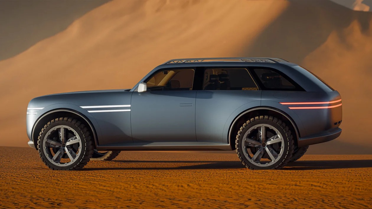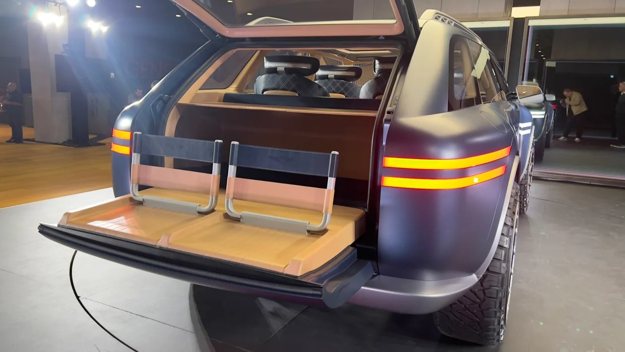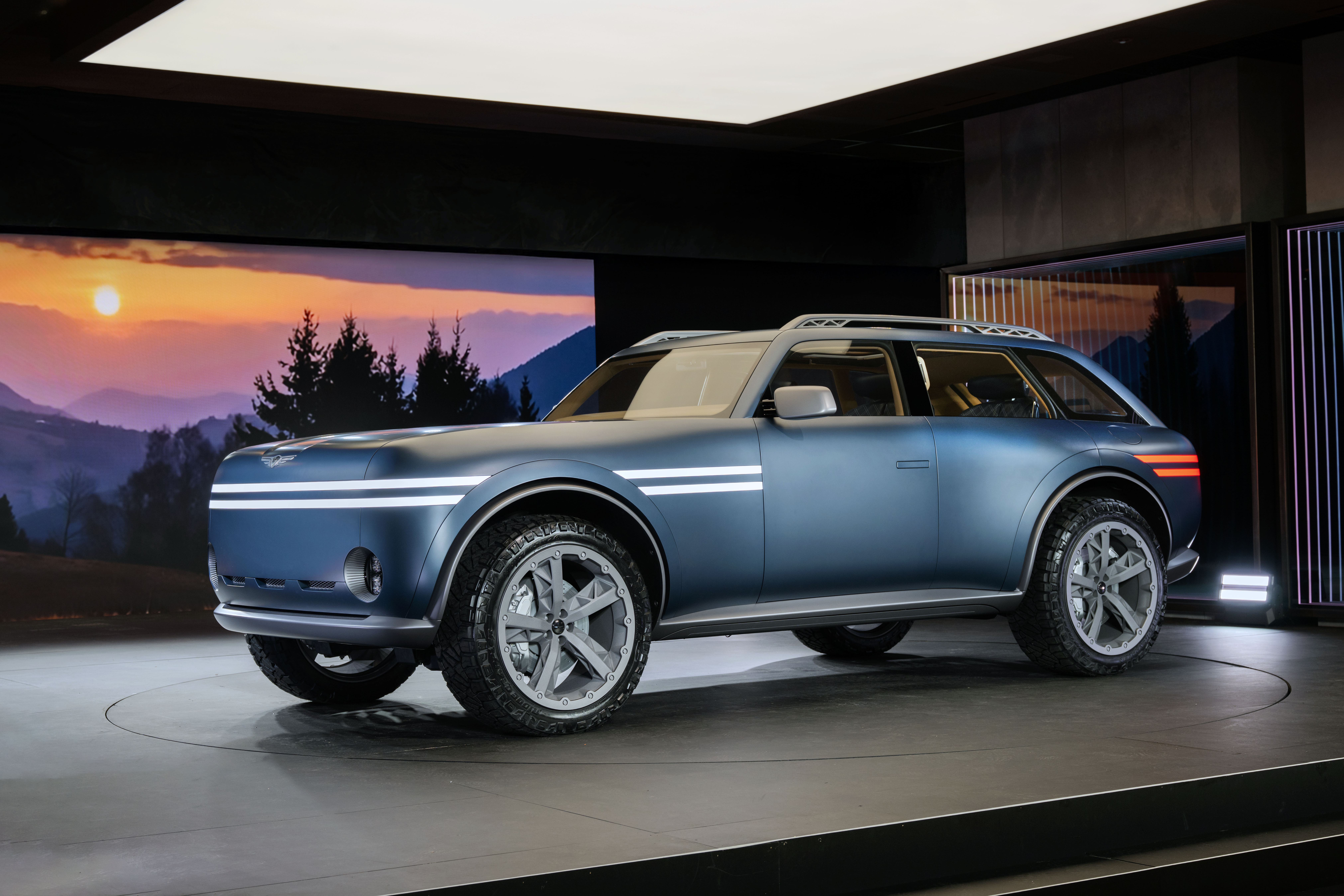 특히 긴 후드와 세련된 캐빈, 가파른 C필러로 기존 SUV와 차별화된 독특한 실루엣을 완성했다. 위아래로 분할되어 열리는 테일게이트는 제네시스 시그니처 투라인 헤드램프와 조화를 이루며 실용성과 디자인을 동시에 충족시켰다.