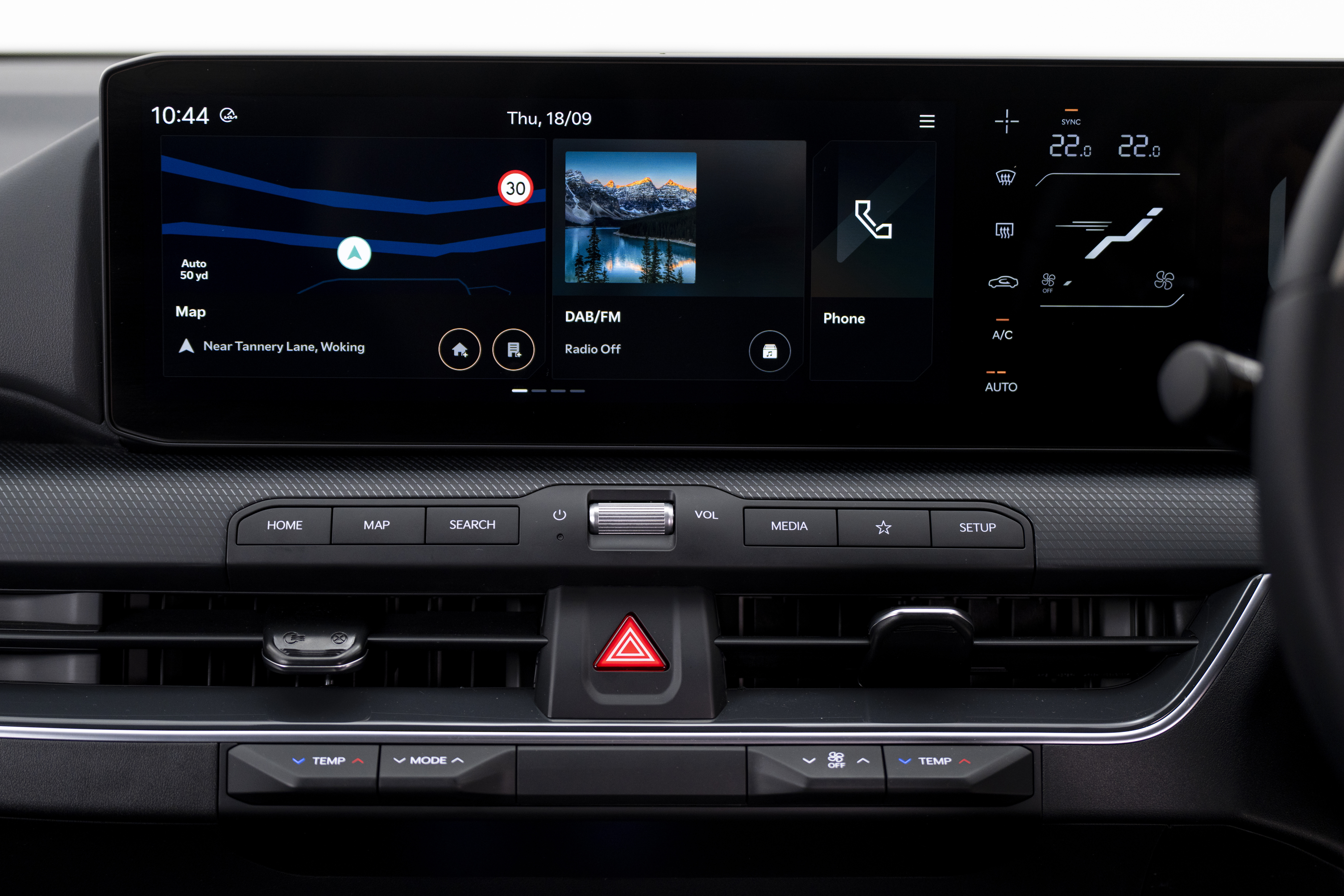 실내에는 12.3인치 계기판, 5.3인치 공조 디스플레이, 12.3인치 인포테인먼트를 통합한 파노라믹 디스플레이가 자리하며, 무선 애플 카플레이와 안드로이드 오토를 전 트림에 기본 제공한다. 상위 트림에서는 하만카돈 오디오, 열선·통풍 시트, 무선 충전 기능, 디지털 키 2.0(UWB 기반) 등 프리미엄 사양이 적용된다. AI 음성 비서와 OTA 업데이트, 스트리밍 서비스 등도 지원한다.