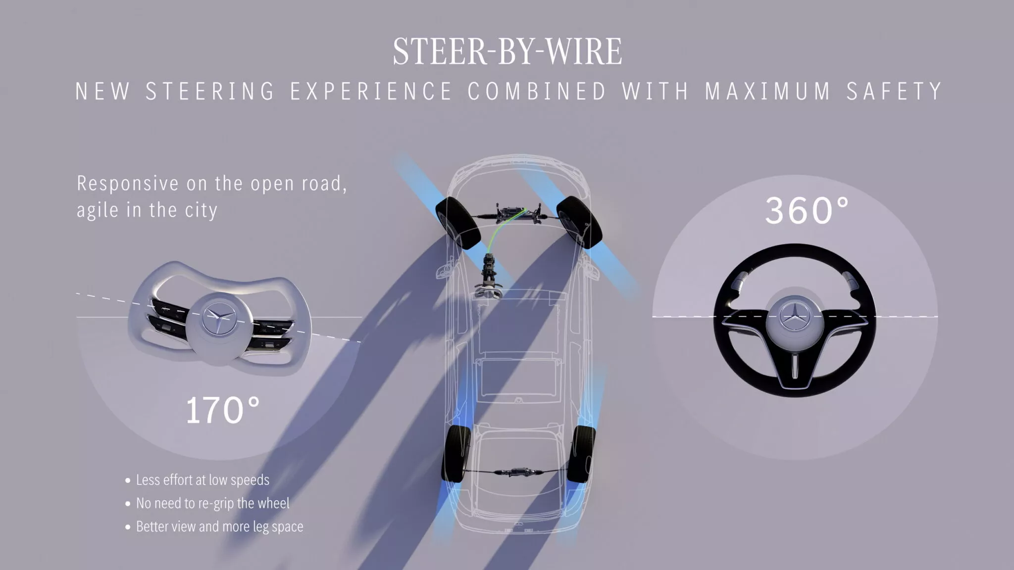 비전 아이코닉은 스티어바이와이어(steer-by-wire) 기술을 통해 조향 감각도 새롭게 정의했다. 스티어링 휠과 바퀴를 전자 신호로 연결해 조향 응답성을 높이고, 후륜 조향과 연동해 긴 차체임에도 주차나 회전이 수월하다.