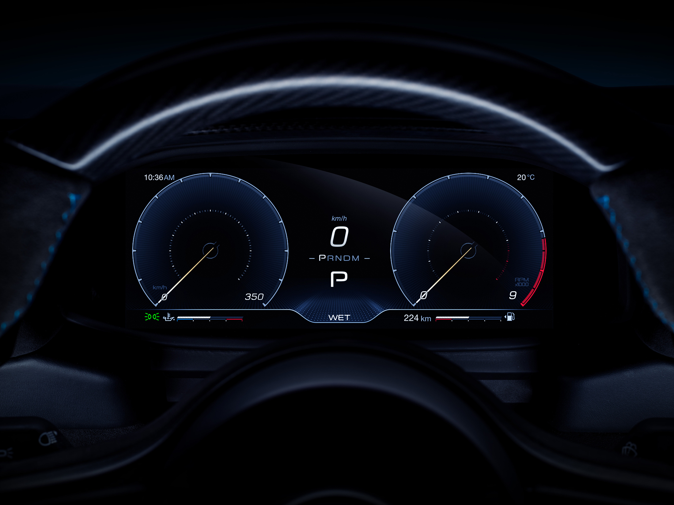 실내 인테리어는 각진 모서리 등을 없앤 단순한 디자인으로 운전자가 온전히 드라이빙에 집중할 수 있도록 구성했다. 2개의 10인치 디지털 디스플레이는 각각 계기판과 인포테인먼트 시스템에 적용되고, 고급스러운 탄소섬유로 마감된 센터콘솔에는 스마트폰 무선 충전 패드, 4가지 주행 모드 셀렉터가 자리잡았다.